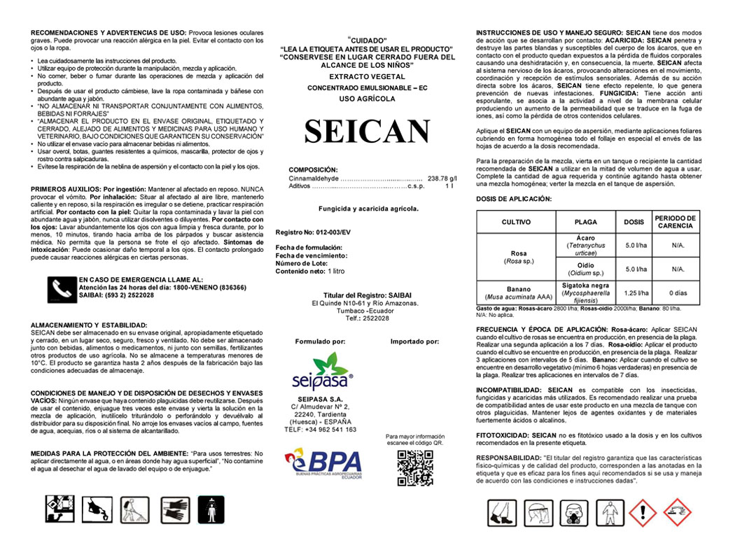 - ACARICIDA: SEICAN® penetra y destruye las partes blandas y susceptibles del cuerpo de los ácaros, que en contacto con el producto quedan expuestos a la pérdida de fluidos corporales causando una deshidratación y, en consecuencia, la muerte. SEICAN® afecta al sistema nervioso de los ácaros, provocando alteraciones en el movimiento, coordinación y recepción de estímulos sensoriales. Además de su acción directa sobre los ácaros, SEICAN® tiene efecto repelente, lo que genera prevención de nuevas infestaciones.